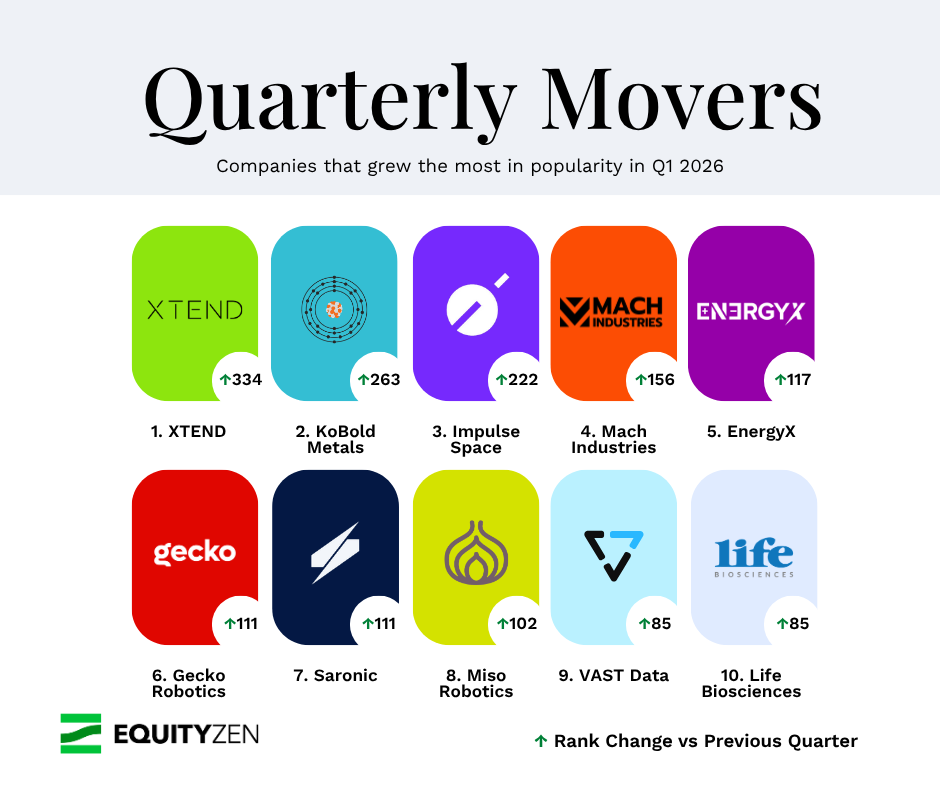- The Energy and Resource Boom: As the AI revolution demands unprecedented power, investors are aggressively targeting the raw materials supply chain. KoBold Metals (+263), which uses AI for mineral exploration, was the second-highest mover of the quarter. Lithium battery maker EnergyX (+117) also saw a top-five surge in popularity, signaling that investors are hunting for clean energy and mining innovation.